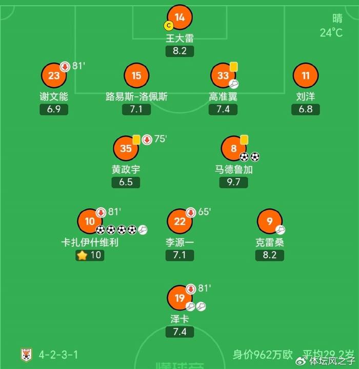观看入口-泰山队赛后评分,一人得满分10分,两人9分以上,球员集体高分